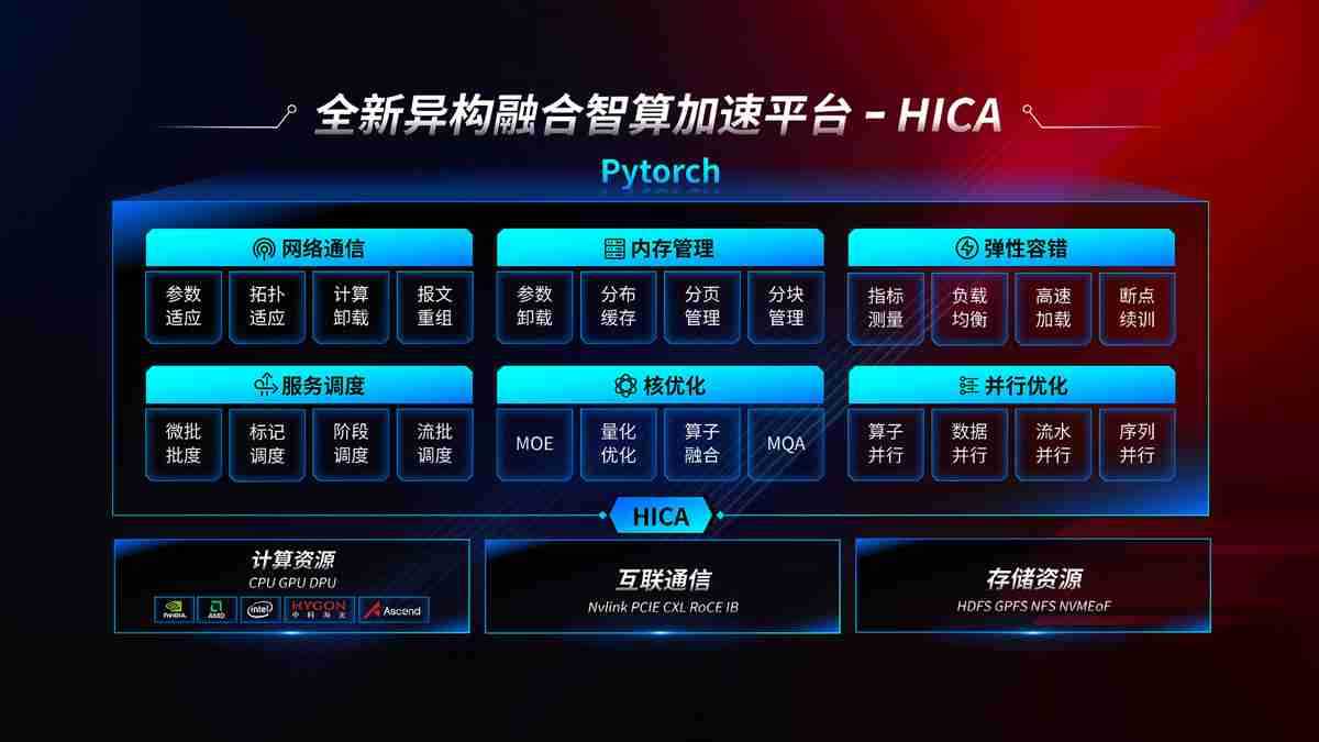 通过自研的服务层、、中间适配层、、、以及调度编排算法,,,,采用数据并行、、、、模型并行等多种并行方式,,把并行计算任务进行有效的分解,,使其分别由相应的软件栈和算力资源来承接。。。。当GPU资源变化,,,,HICA可以实时动态调度计算子任务并调整模型拓扑和架构,,,,以充分聚合各种算力资源。。。