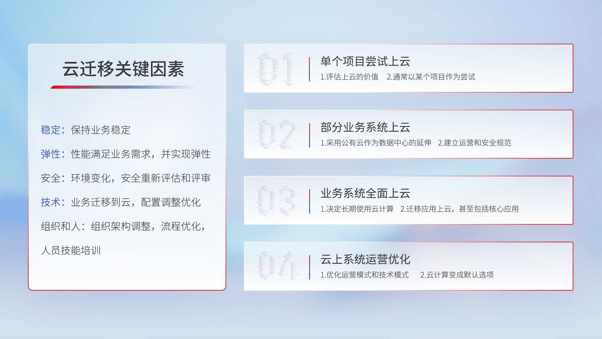 结合实际业务,,从规划设计、、、、云平台选型、、云原生改造、、、数据迁移、、、、集成交付,,,,迁移全过程为客户识别最佳上云路径,,,做好风险识别管理,,,设计网络架构、、、身份权限、、安全审计合规、、、、操作审计、、、日志审计、、监控告警策略、、、、多站点容灾设计等,,对云上基础设施进行整体规划,,提升IT治理水平,,,,以满足弹性、、高可用、、、、高性能的需求。。。