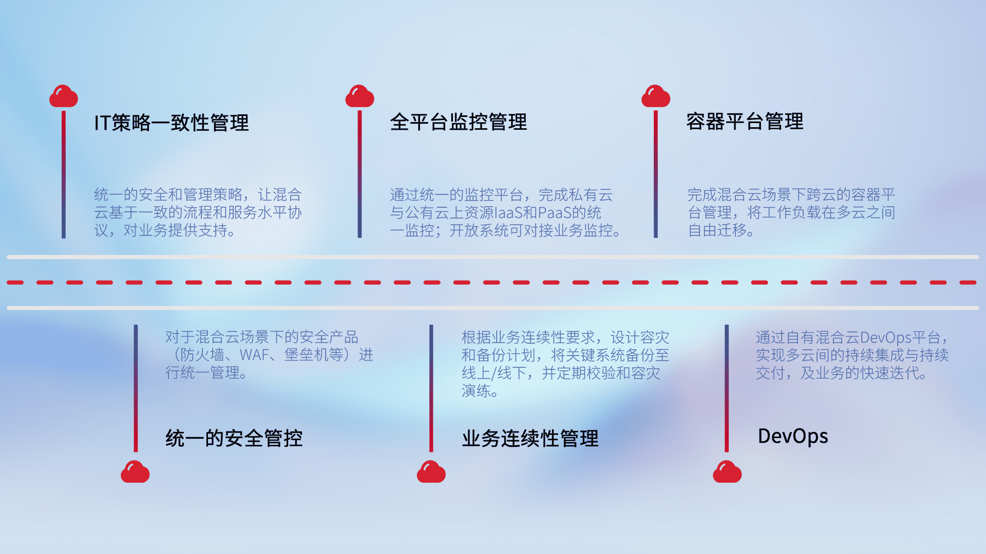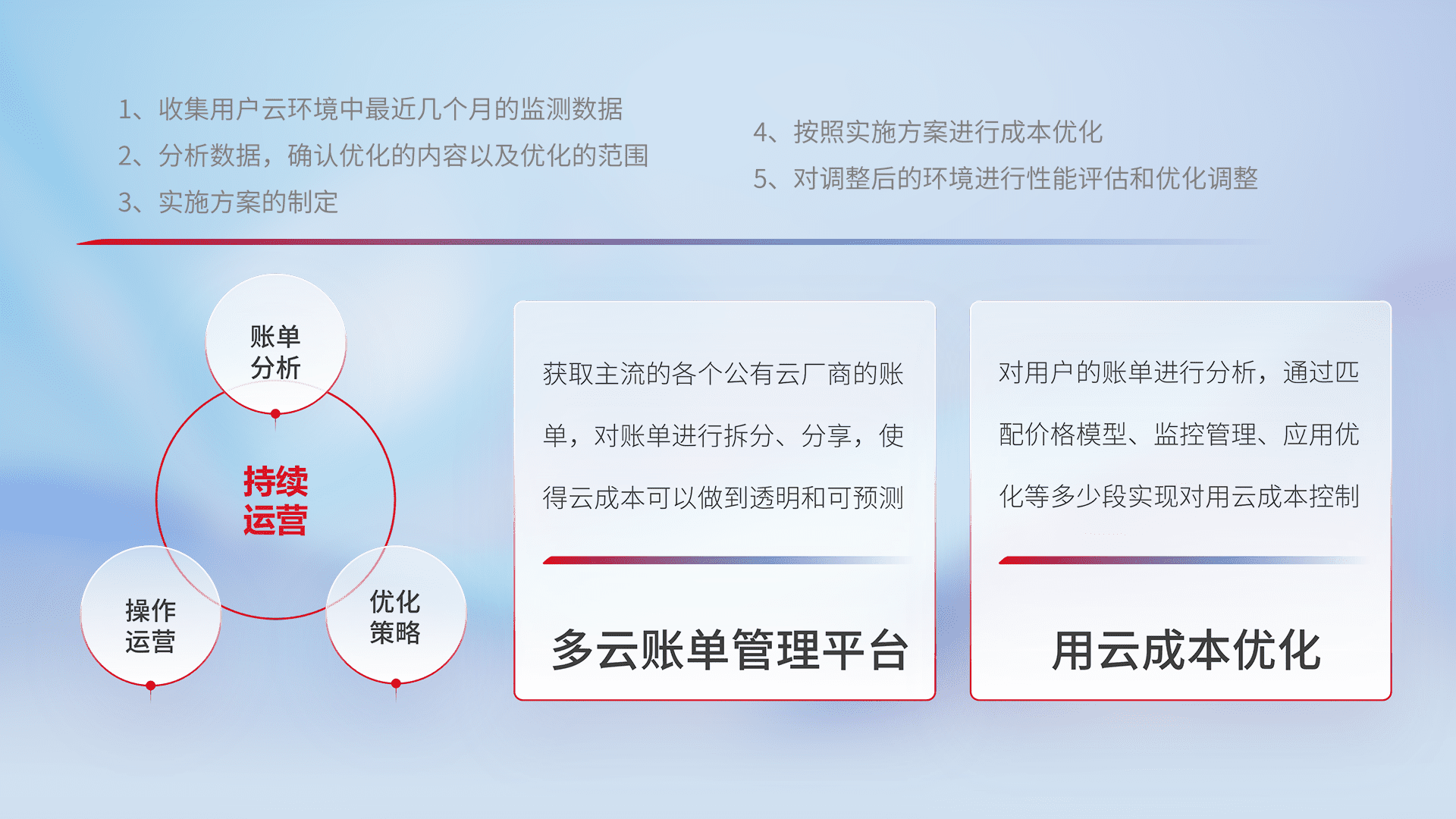 通过多云纳管,,,以统一的资源数据模型把客户的云资源进行抽象和封装,,,,进而实现对多云资源的统一操作,,,,保障云资源管理的可靠性、、、稳定性与可用性。。量身定制化运维内容,,配置、、、、开发运维、、补丁管理、、、备份、、监控、、、、认证和访问管理、、、、审计和日常巡检等,,,保障在用云过程中的可靠度,,,稳定度以及高可用率。。